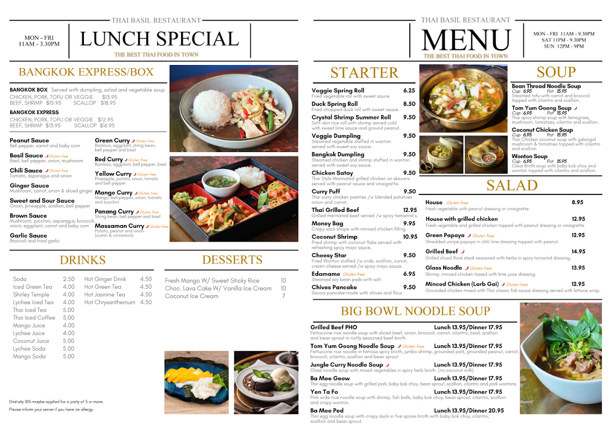 Start your meal with the popular Bangkok dumplings, bursting with flavor, or the Papaya salad, which skillfully balances freshness and heat. The lunch specials shine with options like the Grilled Beef Pho and the aromatic Jungle Curry Noodle Soup, both priced at just $13.95. For a deeper dive, indulge in the expertly crafted curries—ranging from Green Curry to Massaman—each promising a symphony of taste.